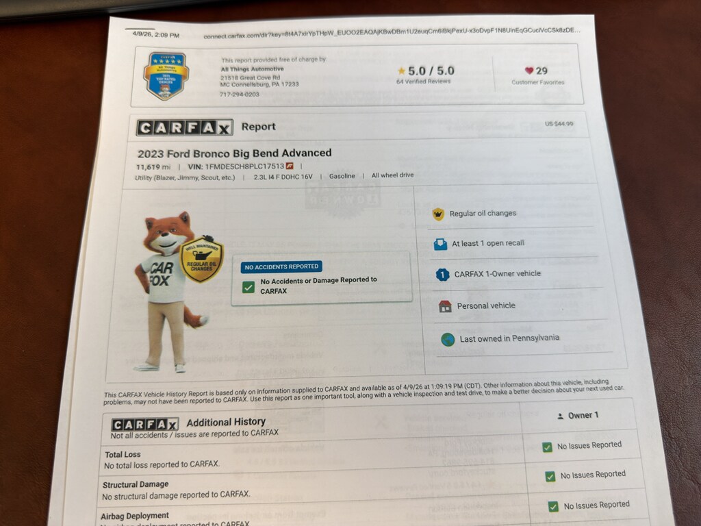 Visit our McConnellsburg, PA location to inspect this low-mileage 2023 Ford Bronco Advanced Big Bend and experience its combination of off-road features and modern technology firsthand. Test drives available by appointment.