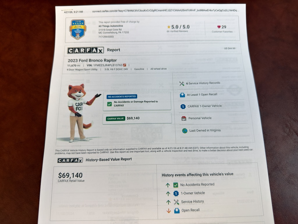 Located in McConnellsburg, PA, this 2023 Ford Bronco Advanced Raptor is a rare find with low miles, exceptional documentation, and no shortage of attitude. Schedule a test drive and experience the blend of comfort, tech, and off-road prowess for yourself.