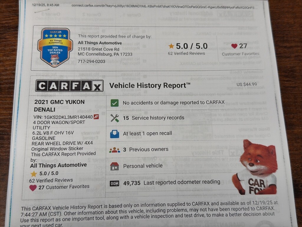 This specific GMC Yukon Denali is competitively priced and currently offered at the best price in the area, providing exceptional value for buyers seeking premium capability and comfort. Whether you need a capable family hauler, a vehicle for towing, or a luxurious daily driver, this GMC Yukon checks all the boxes. Visit our McConnellsburg, PA location to experience the 2021 GMC Yukon Denali in person and take advantage of this outstanding price and available financing options.