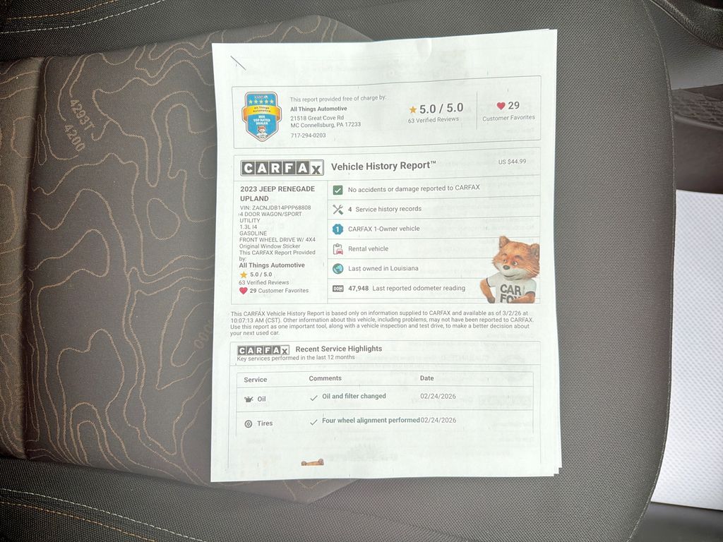2023 Jeep Renegade Upland â" 4WD, 1.3L 4â'Cyl, 47,823 miles â" Bedford, PA. Clean, rugged and ready for wherever the road leads, this Jeep Renegade Upland combines compact SUV agility with Jeep capability. Powered by an efficient 1.3L turbocharged 4â'cylinder and equipped with confident 4WD, it delivers responsive performance and excellent fuel economy for daily commutes and weekend adventures. Inside, a driver-focused cabin features Navigation to keep you on course and Automatic Climate Control for comfortable trips in any weather. Safety-minded features include Forward Collision Warning and Lane Departure Warning, helping you stay aware and protected on the highway. Remote Start adds convenience and comfort, warming or cooling the interior before you step inside. This Jeep Renegade Upland strikes a smart balance between city-friendly dimensions and off-road DNA â" compact for parking, capable for trails. The exterior reflects Jeep's distinctive design, while the interior offers practical storage and modern tech to streamline every drive. With 47,823 miles, this model has been gently pre-owned and maintained for reliable performance. Located in Bedford, PA, this Jeep Renegade Upland is competitively priced and represents the best value on the market for its combination of features, condition, and capability. Act quickly â" vehicles with this mix of economy, safety tech, and 4WD don't stay available long. Schedule a test drive today and see why this Jeep Renegade is the smart choice.