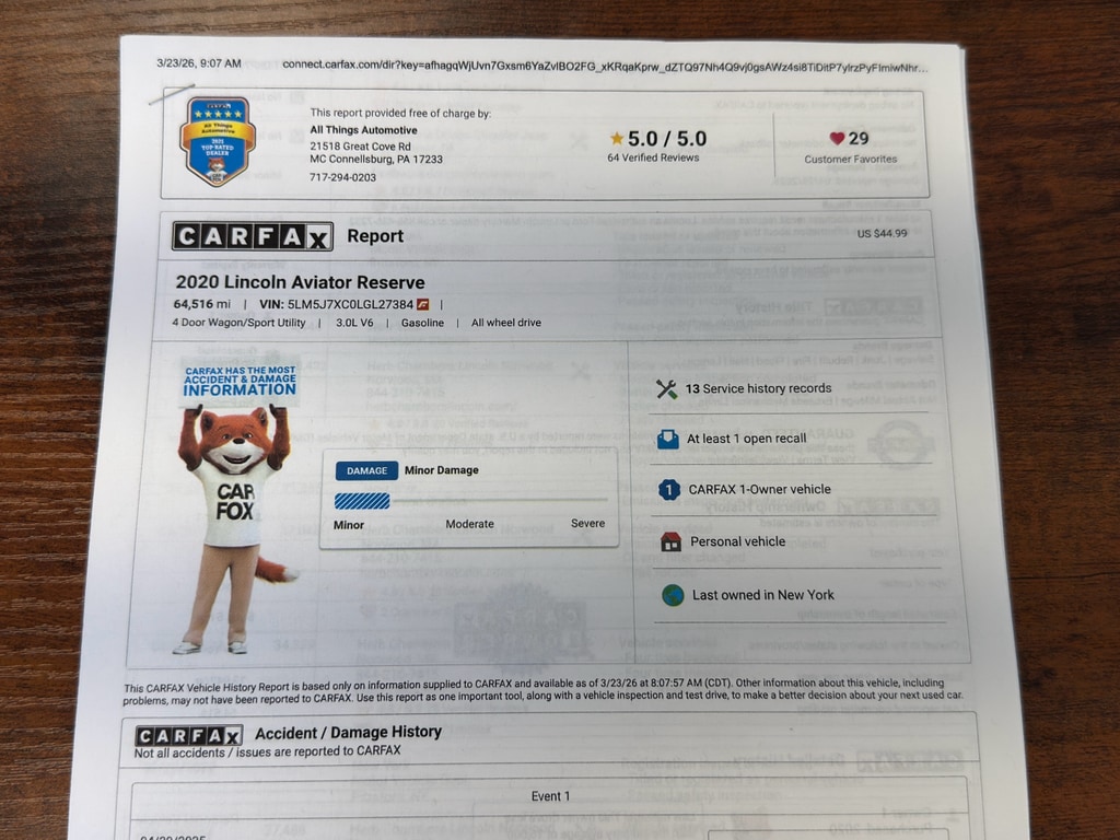 This vehicle carries a CARFAX 1-Owner history, offering added peace of mind regarding its care and maintenance. Whether you're seeking a stylish family hauler, a capable weekend getaway companion, or a sophisticated commuter, this Lincoln Aviator Reserve delivers the refinement and technology you expect from a luxury SUV. Conveniently located in McConnellsburg, PA, it's ready for your test drive and inspection. Contact us to arrange a viewing and experience the exceptional presence and performance of this 2020 Lincoln Aviator Reserve for yourself.