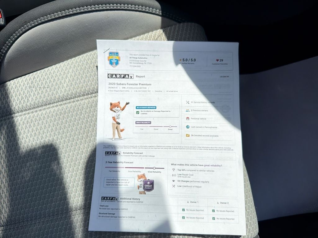 Experience exceptional value with this 2020 Subaru Forester Premium, a versatile SUV located in Bedford, PA. Featuring a fuel-efficient 4-cylinder 2.5L gasoline engine and AWD, this Subaru Forester delivers confident handling and year-round traction. With only 28,563 miles, this low-mileage gem is priced to move - you'll find the best price for a Subaru Forester in this condition. Comfort and convenience are highlighted by Automatic Climate Control and Remote Start, perfect for seasonal comfort before you even get in. Safety-focused features include Lane Keep Assist to help maintain lane position and enhance driver confidence. Stay connected on the go with Hands Free Bluetooth, allowing seamless calls and audio streaming without distraction. The CARFAX Clean Report confirms a well-maintained history, giving you added peace of mind. The Premium trim adds thoughtful upgrades for daily driving and weekend adventures, while the roomy interior and elevated ride height make it practical for family, work, or outdoor activities. AWD capability handles rain, snow, and rough roads with ease, and the 2.5L engine balances efficiency with dependable performance. Located in Bedford, PA, this Subaru Forester is ready for immediate test drives. With low mileage, sought-after features, and the best price in the area, this 2020 Subaru Forester Premium won't last long. Schedule a viewing today and see why this Subaru Forester is the smart choice for value, safety, and utility.