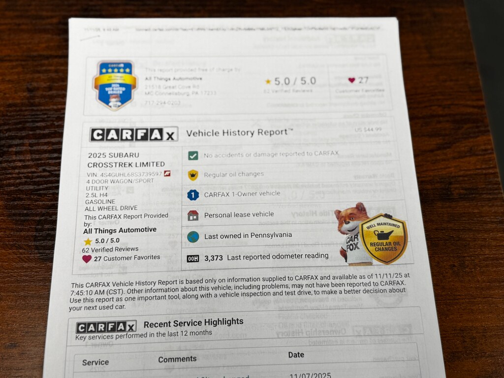 This Subaru Crosstrek's low mileage and single-owner history make it a standout selection among pre-owned SUVs in the region. Priced competitively as the best deal in McConnellsburg, PA, it's ready to provide dependable transportation with modern features and Subaru's durable engineering. Contact us to schedule a test drive and experience this exceptional 2025 Subaru Crosstrek Limited for yourself.