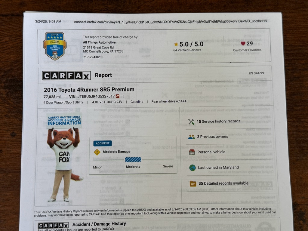 Discover rugged reliability with this 2016 Toyota 4Runner SR5 Premium 4WD, now available in McConnellsburg, PA. Powered by a robust V6 4.0L gasoline engine, this iconic SUV blends legendary Toyota durability with premium features for confident daily driving and weekend adventures. The SR5 Premium trim elevates comfort with genuine leather seats and a thoughtfully appointed interior that makes every journey enjoyable.